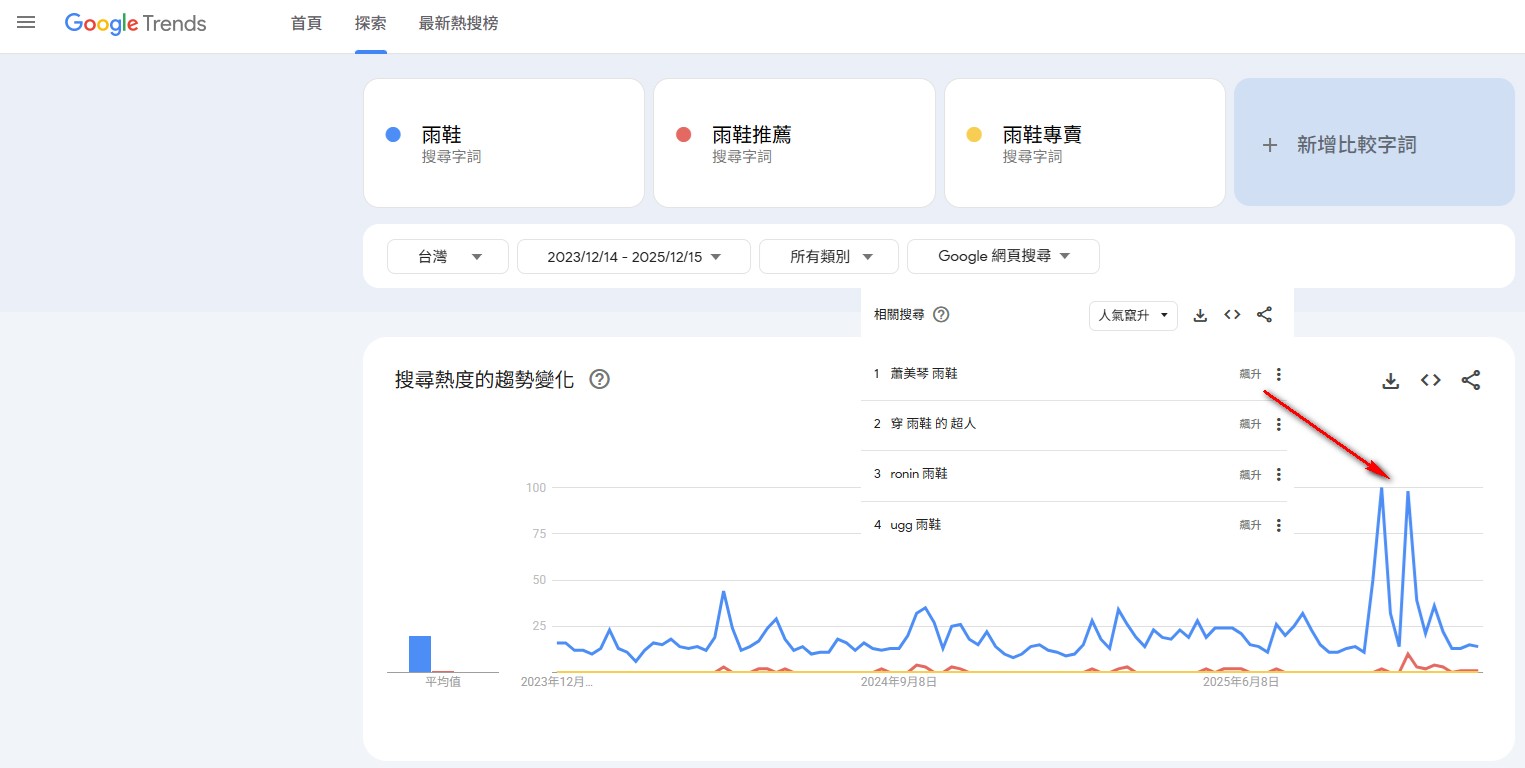 - 操作: 輸入核心關鍵字(如「雨鞋」),查看過去 12 個月的曲線圖。